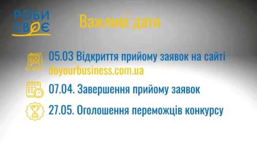 Прийом заявок на конкурс триватиме до 7 квітня 2025 року. А 27 травня оголосять переможців, які отримають фінансову підтримку та експертний супровід для реалізації свого бізнесу.