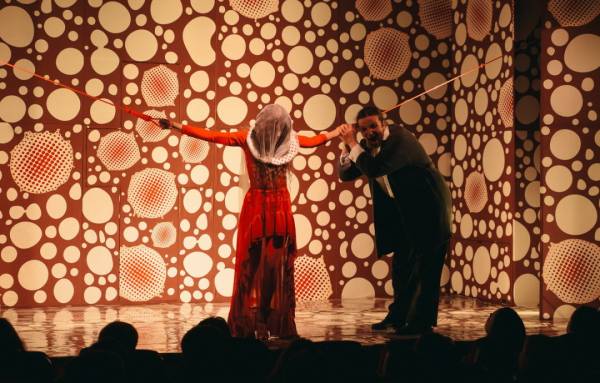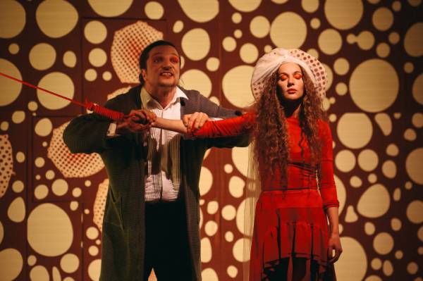 Візуальна концепція оформлена водночас із прямою відсилкою до червоної сукні в горошок (тієї самої, в яку була вдягнута франкова героїня в останню зустріч і в якій має врешті-решт з’явитися до свого коханого) та з натяком на творчість японської художниці Яйої Кусами, живопис та колажі якої виконані з одержимим повтором візерунків – кружечків та кіл в «ядерних» кольорах. Ця мисткиня (досить поважного віку) відома ще й тим, що періодично лікується в клініці для психічно хворих. Таким чином талановита сценографія, костюми та вдала робота зі світлом, яке постійно змінюється на жовтий, червоний, зелений колір – додають виставі сюрреалістичності та психоделічності, підкреслюючи запалену та палаючу свідомість і душевну «вивихнутість» героїв.