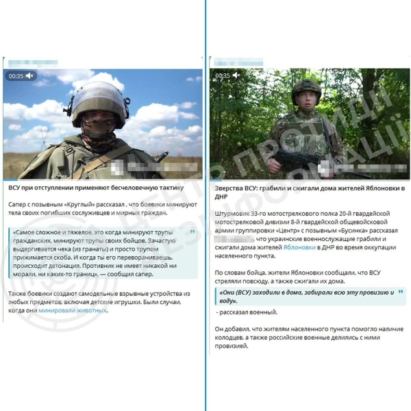 Зазначається, що у прокремлівських медіа з’явилися “свідчення” російських військових, що нібито ЗСУ “грабують та спалюють будинки” жителів Яблунівки Донецької області. Також поширюється дезінформація, що під час відступу українські військові нібито “мінують тіла загиблих цивільних і своїх бійців”.